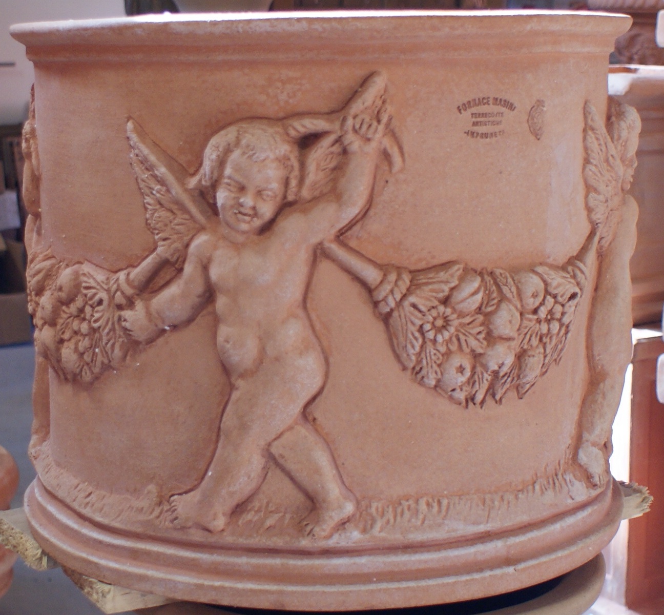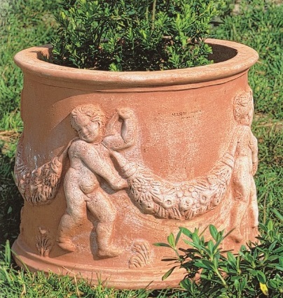 Sterk versierde zware handgemaakte terracotta pot: “Cilindro grande Putti “, 41x35cm (dxh).