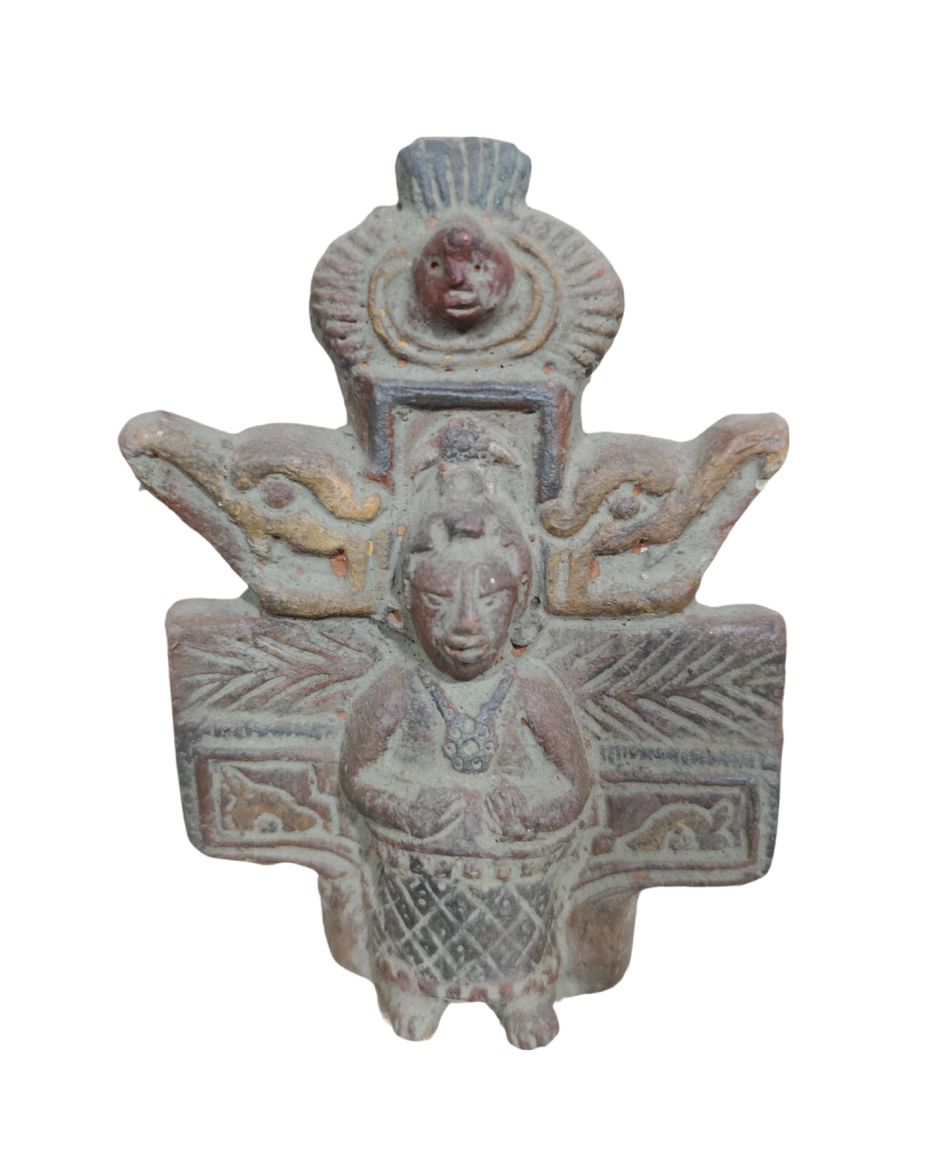 Dit beeldje uit de Maya cultuur toont een figuur met een uitgebreide hoofdtooi en een ketting, en is omgeven door symbolische elementen.
