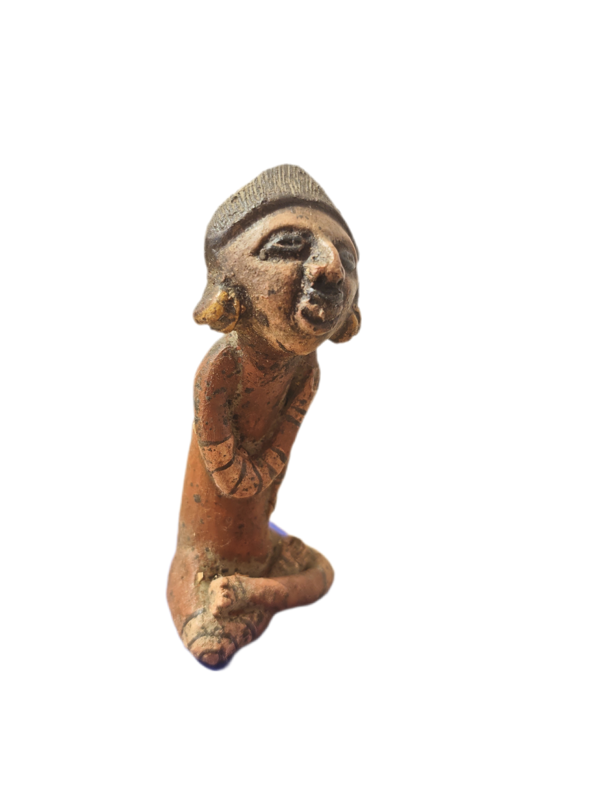 Dit beeldje toont een met gekruiste benen zittende Precolumbiaanse terracotta figuur die waarschijnlijk een man voorstelt die cocabladeren kauwt, bekend als een coquero. Dergelijke beeldjes waren vaak afkomstig uit de Carchi-cultuur in Ecuador of de Nariño-cultuur in Colombia, daterend tussen circa 800 en 1500 na Christus. Dit betreft een kopie. De figuur zit in een zittende houding, vaak met de benen gekruist of opgetrokken, en de handen bij de mond of op de knieën, wat geassocieerd wordt met het kauwen van coca. Soortgelijke figuren werden vaak gevonden in graven of gebruikt bij ceremonies.