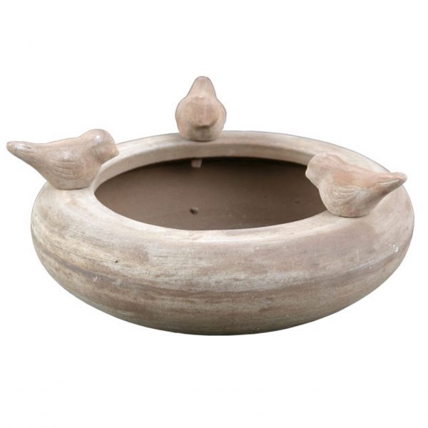 Rond handgemaakt terracotta vogelbad (of voederplaats).