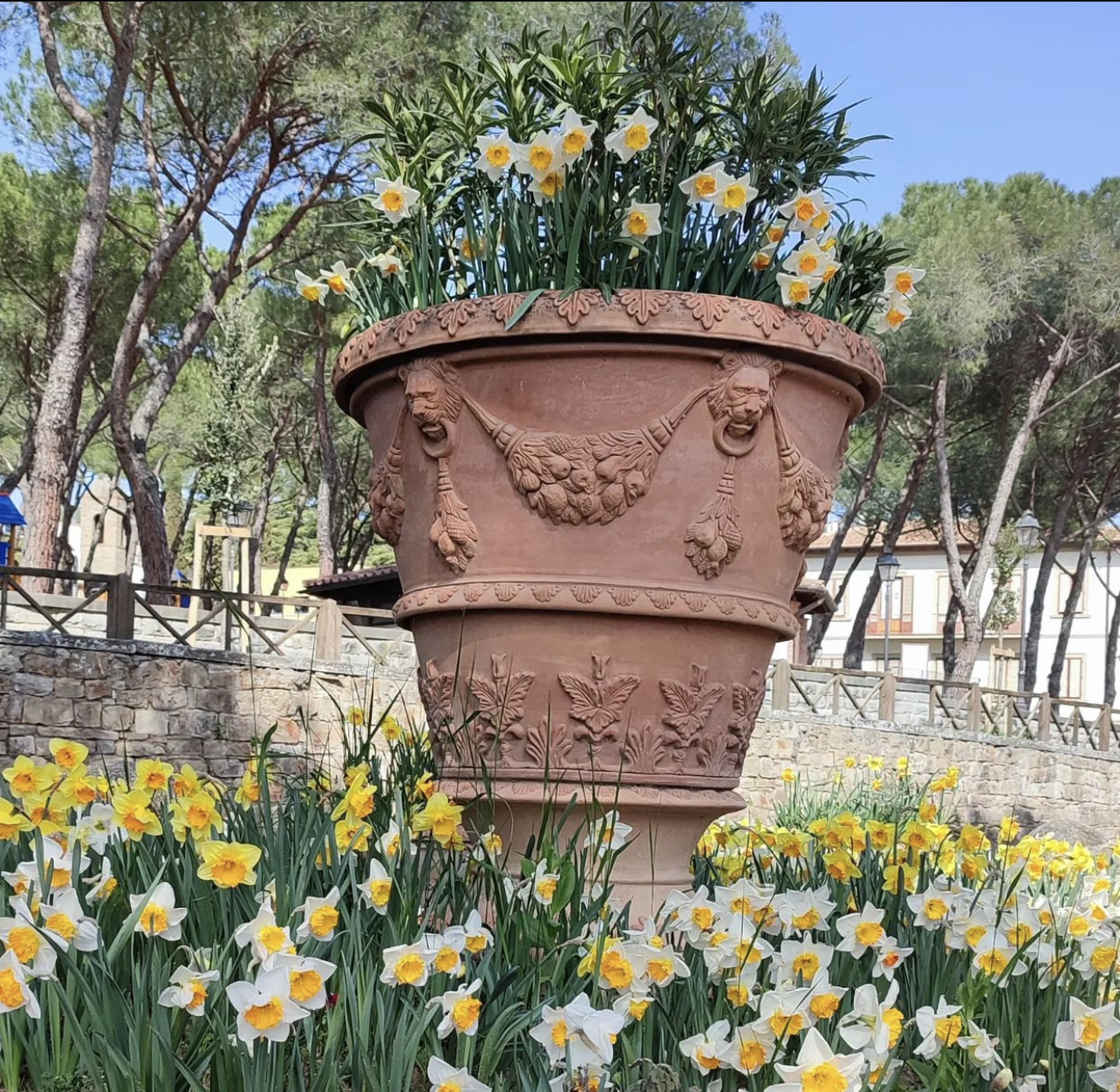 Imposante sterk versierde (erg precies afgewerkt) handgemaakte Impruneta terracotta pot “Vaso Gioia”.